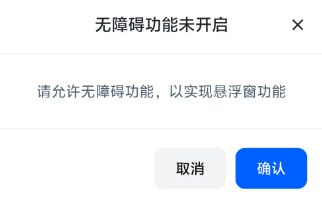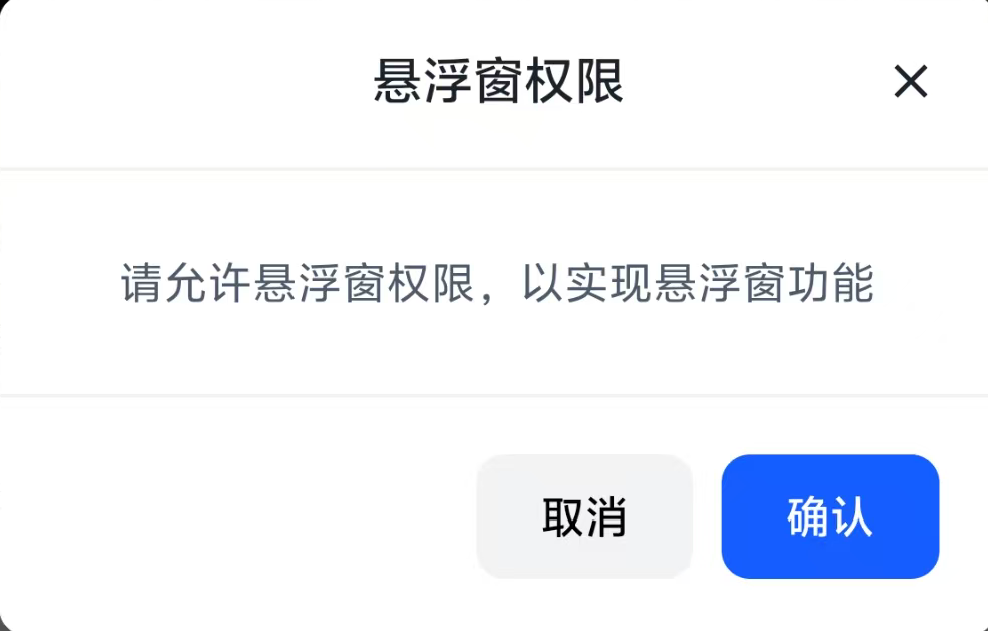首次运行过成功点击运行按钮会弹出悬浮窗提示 请点击确认按钮前往设置授予悬浮穿权限